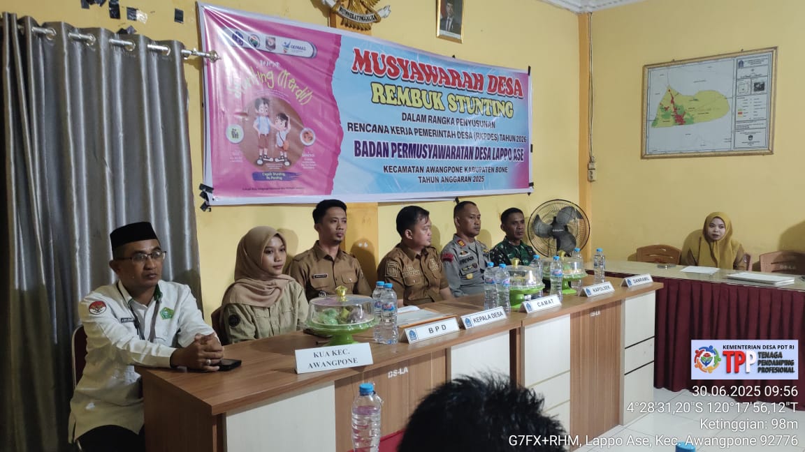 Awangpone – Pemerintah Desa Lappo Ase, Kecamatan Awangpone, Kabupaten Bone, menggelar kegiatan Rembuk Stunting yang dirangkaikan dengan Musyawarah Desa (Musdes) Pembentukan Tim Penyusun Rencana Kerja Pemerintah Desa (RKPDes) Tahun 2026. Kegiatan tersebut berlangsung pada hari Senin, 30 Juni 2024 sekitar pukul 10.00 Wita, bertempat di Aula Kantor Desa Lappo Ase. Kegiatan ini merupakan bagian dari agenda pembangunan desa yang mengedepankan partisipasi masyarakat serta sinergi antarinstansi dalam mendukung program prioritas nasional.