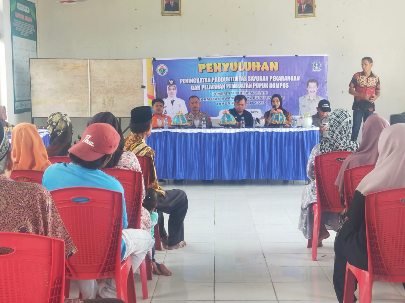 Pada hari Kamis, 04 September 2025 sekira pukul 09.30 Wita, bertempat di Rumah Belajar Desa Mallari, Kecamatan Awangpone, Kabupaten Bone, telah dilaksanakan kegiatan Penyuluhan Peningkatan Produktivitas Sayuran Pekarangan sekaligus Pelatihan Pembuatan Pupuk Kompos. Kegiatan ini merupakan upaya pemerintah desa bersama pihak terkait dalam meningkatkan pengetahuan dan keterampilan masyarakat guna mendukung ketahanan pangan keluarga serta pemanfaatan pekarangan rumah secara optimal.