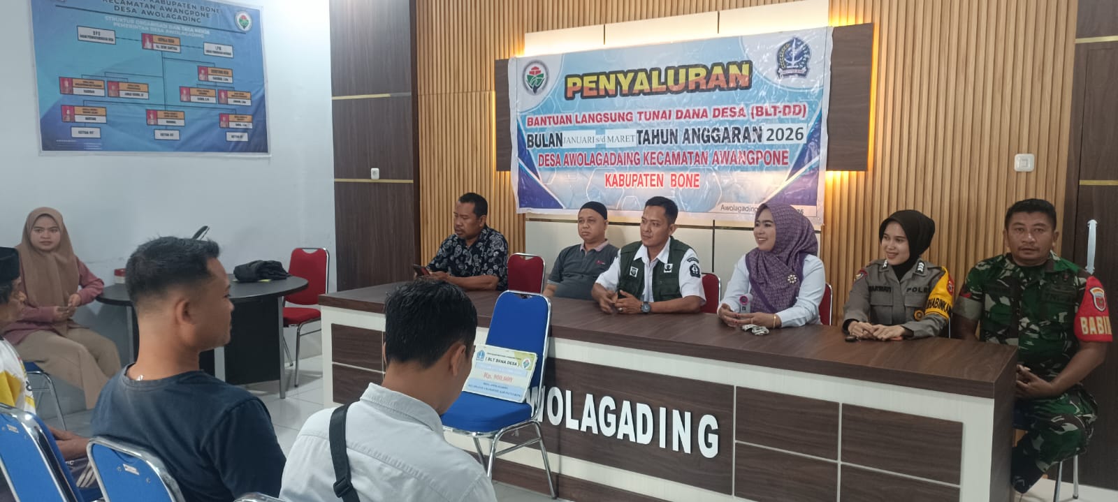 Pada hari Rabu tanggal 11 Maret 2026 sekitar pukul 10.00 WITA bertempat di Kantor Desa Awolagading, Kecamatan Awangpone, Kabupaten Bone telah berlangsung kegiatan penyaluran Bantuan Langsung Tunai Dana Desa (BLT-DD) Pemulihan Ekonomi dan Penanganan Kemiskinan Ekstrem Desa Awolagading. Kegiatan tersebut dibuka langsung oleh Kepala Desa Awolagading, Hj. Dewi Sartika.