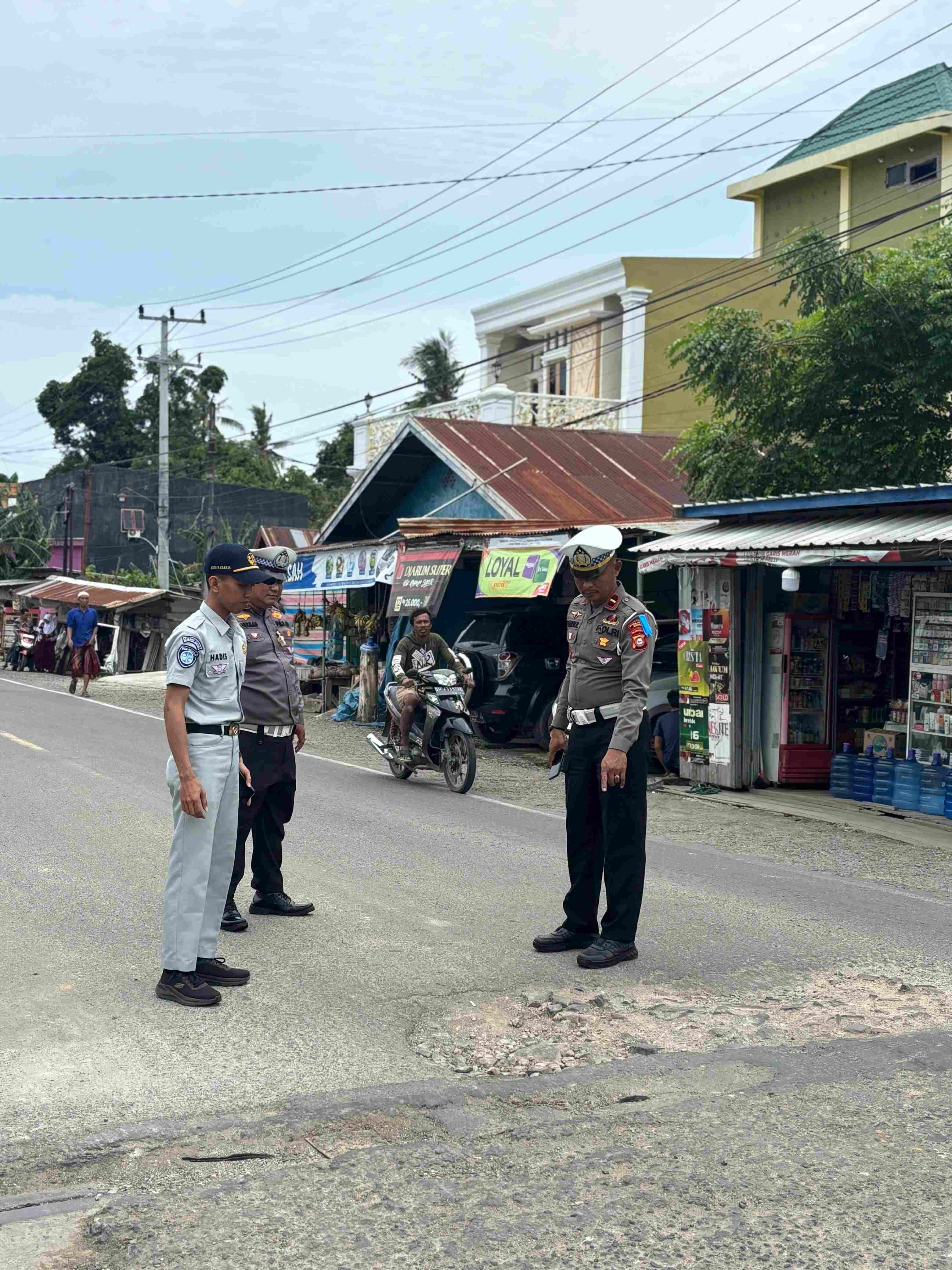 Kanit Patroli Satlantas Polres Bone IPDA Samsul bersama Jasa Raharja Watampone, melaksanakan survey dan pengecekan jalan berlubang yang berpotensi membahayakan pengendara di Jalan Poros Bone – Wajo tepatnya di Kecamatan Dua Boccoe Kabupaten Bone.