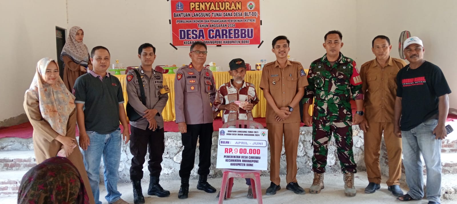 Polresbonetribratanews.com, Bone ~ Awangpone, Pada hari Selasa, tanggal 11 Juni 2024, sekitar pukul 11.20 Wita, bertempat di Aula Kantor Desa Carebbu, Kapolsek Awangpone Polres Bone AKP Andi Muhammad Takdir menghadiri Penyaluran Bantuan Langsung Tunai (BLT) Dana Desa Tahun 2024 untuk bulan April hingga Juni. Kegiatan ini merupakan tindak lanjut program pengentasan kemiskinan ekstrem di Desa Carebbu, Kecamatan Awangpone, Kabupaten Bone.