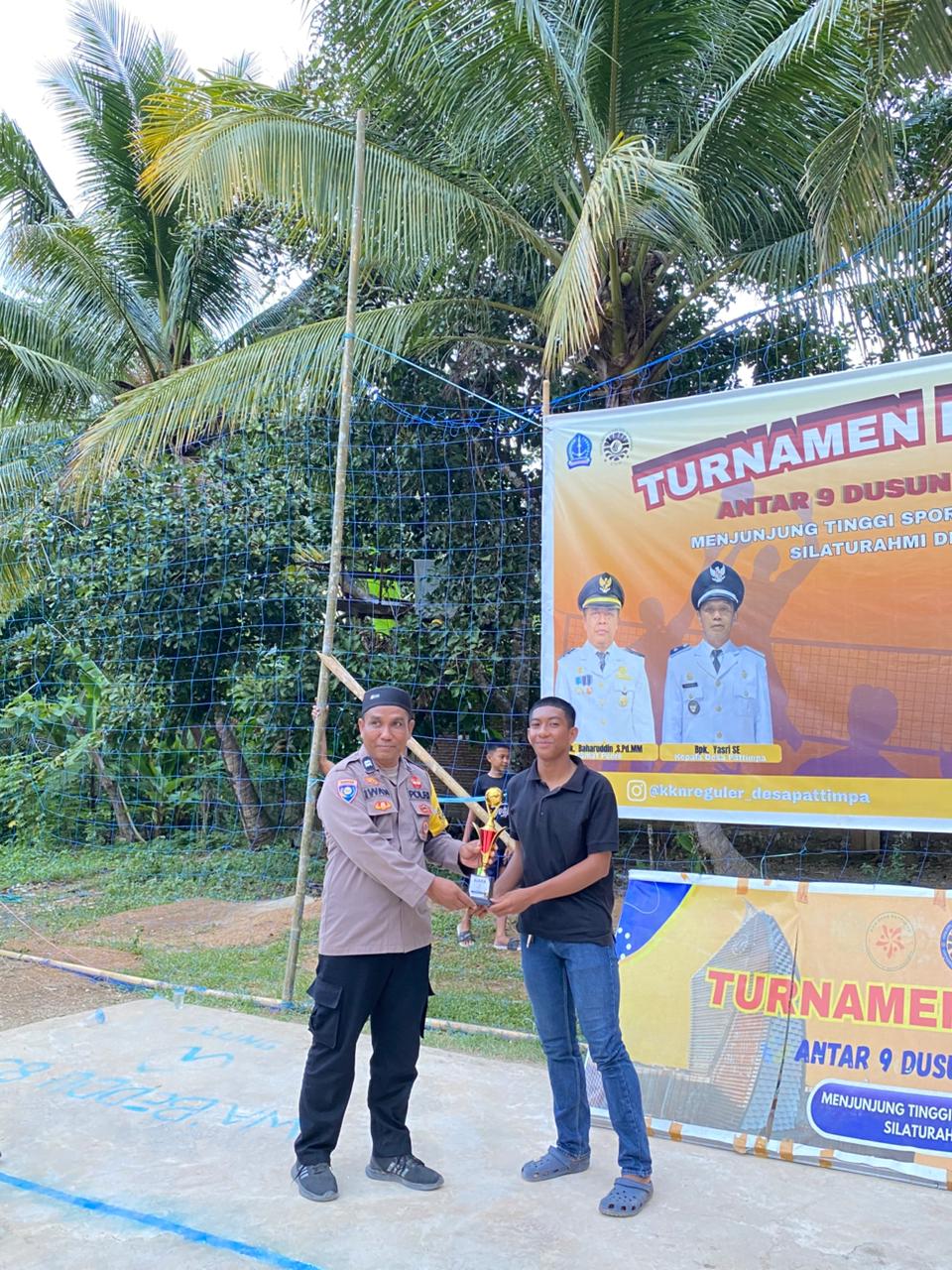 Bone- ponre — Dalam rangka mendukung kegiatan kepemudaan dan mempererat hubungan dengan masyarakat, Bhabinkamtibmas Polsek Ponre Aiptu Iwan bersama dengan Kanit Binmas Aiptu Mulyadi menghadiri acara penutupan dan pemberian trofi turnamen bola voli yang diselenggarakan oleh mahasiswa Kuliah Kerja Nyata (KKN) Reguler LIV – Terpadu XXXII UNM di dusun cinennung desa Pattimpa kecamatan Ponre, Kamis (16/04/2026)