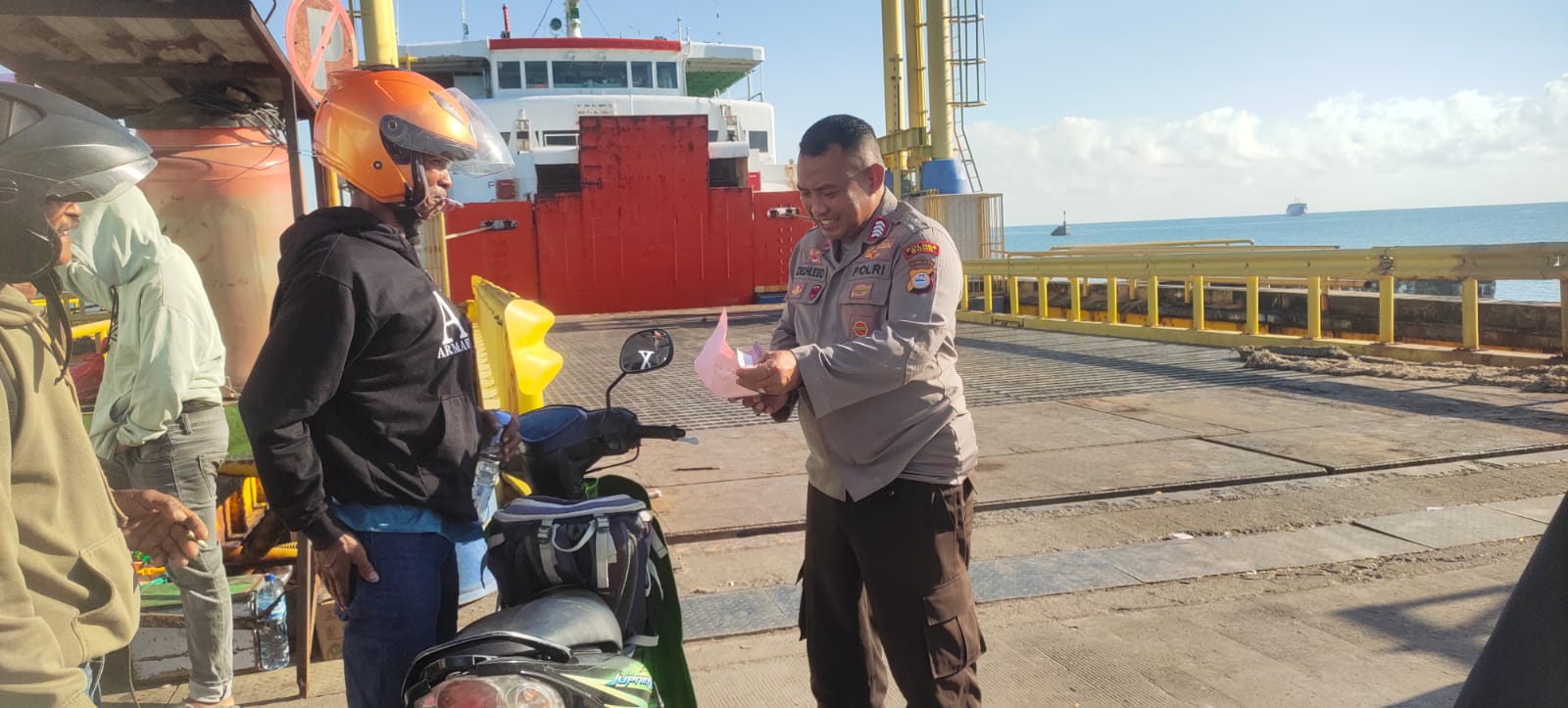 Dilaksanakan oleh Aipda Dedi Hasan Basri di dermaga Pelabuhan Bajoe saat proses pemuatan batang , orang dan kendaraan sedang berlangsung.