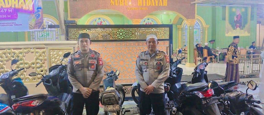 Guna berikan rasa aman saat pelaksanaan shalat tarawih oleh masyarakat , Personil Polsek Kawasan Pelabuhan Bajoe Polres Bone Bripka Aryanto dan Bripka Fahri Yusdar melaksanakan pengamanan shalat tarawih di masjid. Minggu, (22/2/26).
